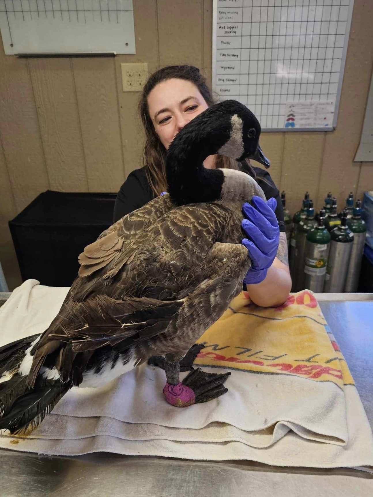Volunteer Cassie and CWR animal ambassador goose Buzzy.